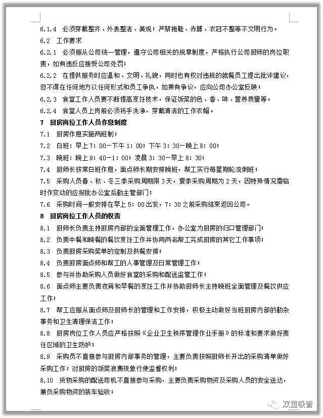 對此,公司組織人員編寫(xiě)了餐飲管理細則,涉及到餐飲管理的各個(gè)方面,從餐飲管理成本、廚師上崗要求、廚房崗位工作權責、餐費管理原則、食堂衛生保障、員工滿(mǎn)意度調查等方面進(jìn)行一一細化,每項內容都有具體的實(shí)施條例!