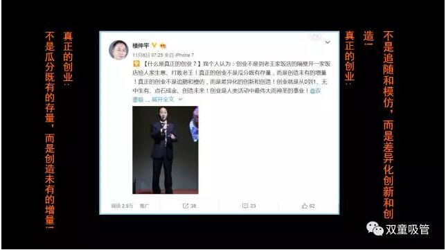 “雙童”樓仲平的演講主題是《一根吸管”的創(chuàng )業(yè)觀(guān)》,精彩分享引起了在場(chǎng)創(chuàng )業(yè)者們的高度認同。下面,吸管妞就和大家分享精彩的課程內容吧!