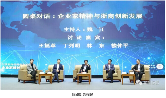 在圓桌對話(huà)上,由浙江大學(xué)管理學(xué)院院長(cháng)魏江主持,物產(chǎn)中大集團董事長(cháng)王挺革、貝達藥業(yè)董事長(cháng)丁列明、杭州綠盛集團董事長(cháng)林東及雙童吸管董事長(cháng)樓仲平和創(chuàng )業(yè)者們展開(kāi)“企業(yè)家精神與浙商創(chuàng )新發(fā)展”的對話(huà)。