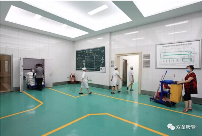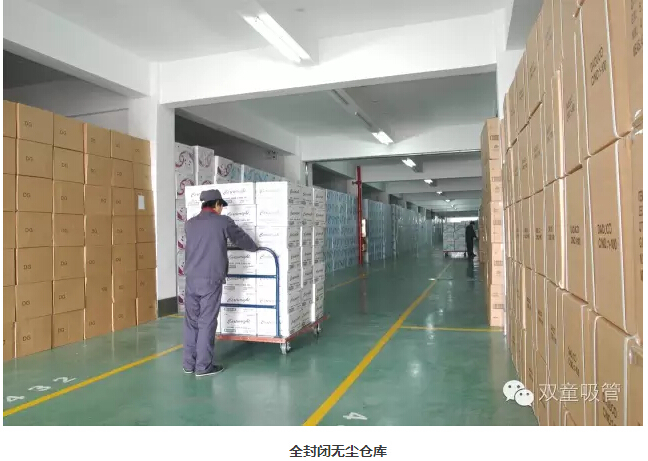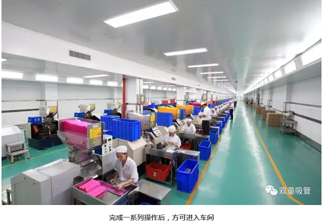 “雙童”車(chē)間的每個(gè)入口,有著(zhù)許多安全、衛生提示的標牌,引導員工門(mén)在進(jìn)入車(chē)間時(shí)要注意安全和衛生防護工作。進(jìn)入車(chē)間內部,一列列整齊的機器、一箱箱五顏六色的吸管、一條條清晰分明的分界線(xiàn),車(chē)間內全部安裝了恒溫空調,屋頂全部進(jìn)行精裝修寬敞明亮,柱子和地腳線(xiàn)用不銹鋼進(jìn)行包邊,大大增加了建筑年限。所有員工皆穿著(zhù)潔白的工作服,正在忙碌地進(jìn)行生產(chǎn)工作。