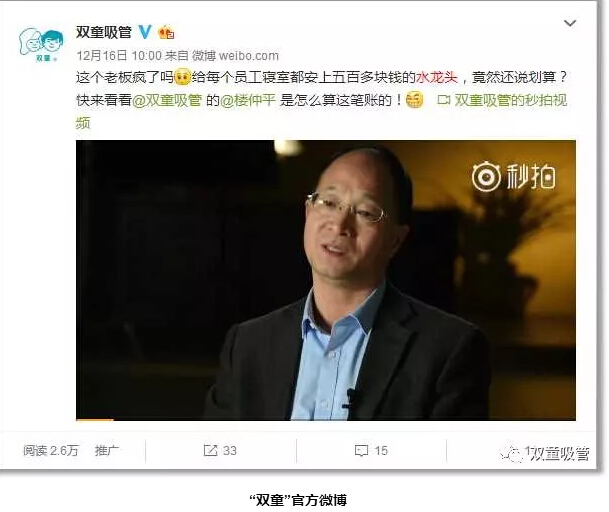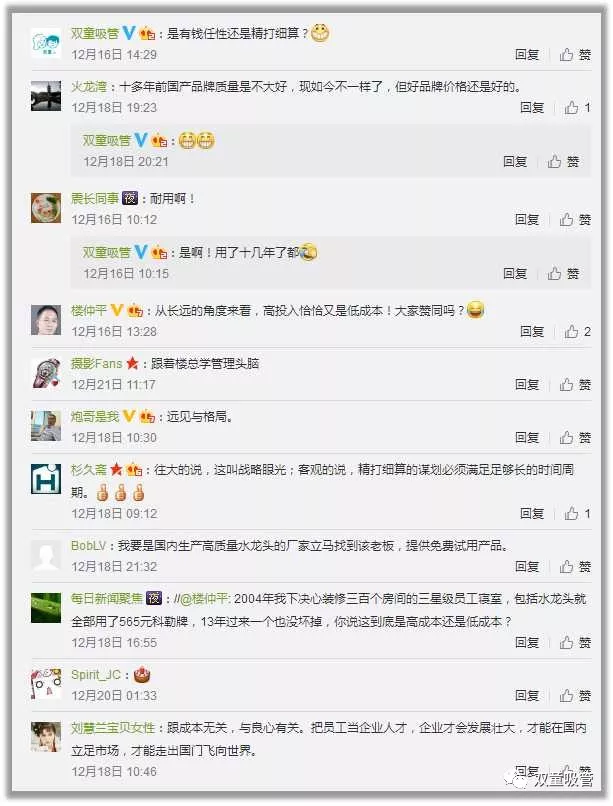 許多民營(yíng)企業(yè)都認為不必給員工用太好的硬件,希望用最低的成本創(chuàng )造最大的價(jià)值。因此,前段時(shí)間,“雙童”官方微博發(fā)布了一條關(guān)于12年前老板給每個(gè)員工寢室配置了五百多元高級水龍頭的微博就引發(fā)了網(wǎng)友的熱議,不少粉絲都很詫異一個(gè)水龍頭五百多元老板居然說(shuō)不貴!這樣的高硬件配置究竟是低成本還是高成本?今天吸管妞就和大家來(lái)好好算算這筆賬劃不劃算!